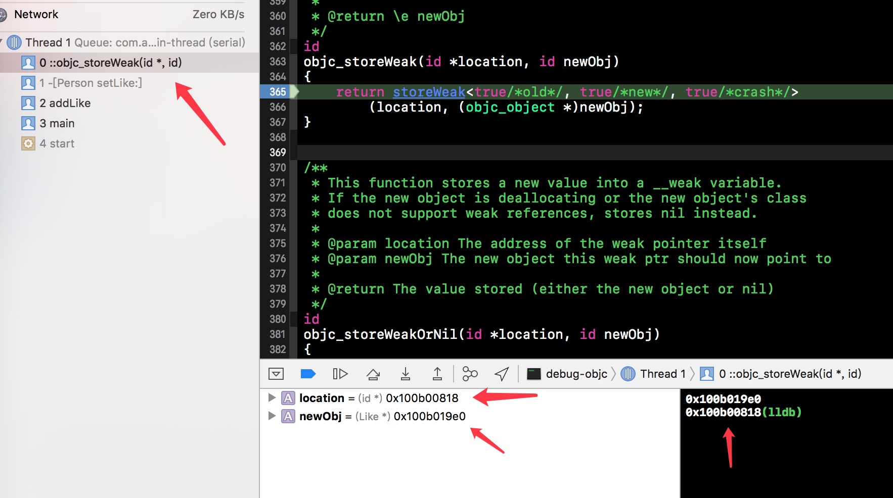 准备工作已经就绪了,我们在Person的中weak修饰的属性下断点,并单步调试,会发现如下的函数调用栈