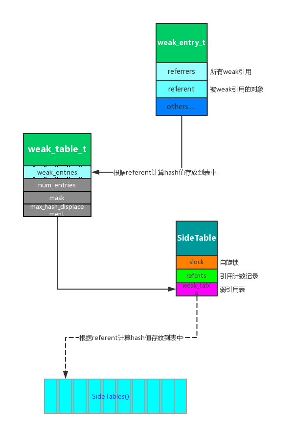 这是一个全局弱引用表。使用不定类型对象的地址作为 key ,用weak_entry_t类型结构体对象作为value。其中的weak_entries成员,从字面意思上看,即为弱引用表入口。其实现也是这样的
