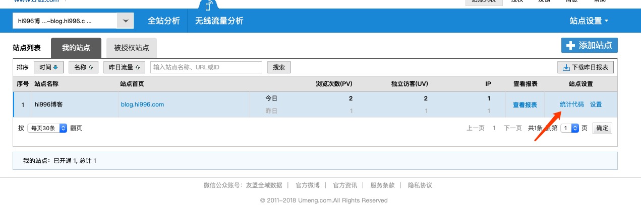 添加站点,自己搭建的博客,需要统计访问量的网站(这里加入我的博客网站),然后点击统计代码进入代码页