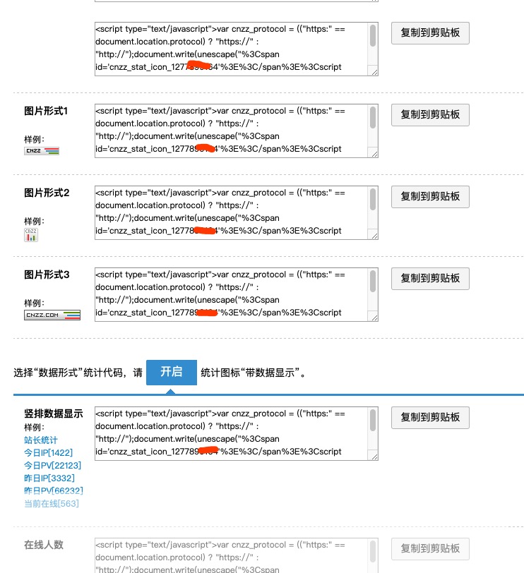代码页有很多样式,我的是红框的演示,纯文字统计,简洁大方,选择其他样式也可以