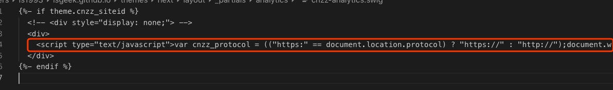 然后打开文件~/themes/next/layout/_partials/analytics/cnzz-analytics.swig,将友盟的统计代码加进去